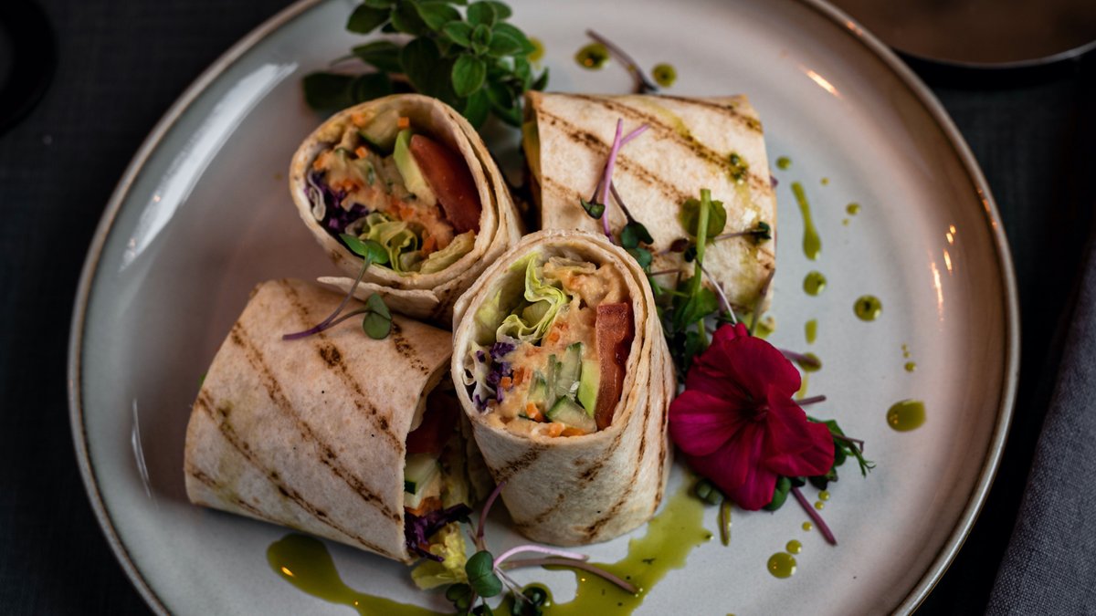 Veģetārais wrap ar humusu, pikantajiem burkāniem, avokado, gurķi, marinētiem sīpoliem un salātlapām. Attēli ir orientējoši un tikai ilustratīviem nolūkiem. Iepakojums ir iekļauts ēdiena cenā.