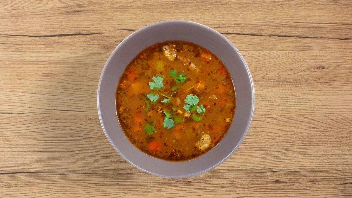 Tilpums 300 ml. Rīsi, paprika, sīpoli, burkāni, selerija, kinza. Attēli ir orientējoši un tikai ilustratīviem nolūkiem. Iepakojums ir iekļauts ēdiena cenā.
