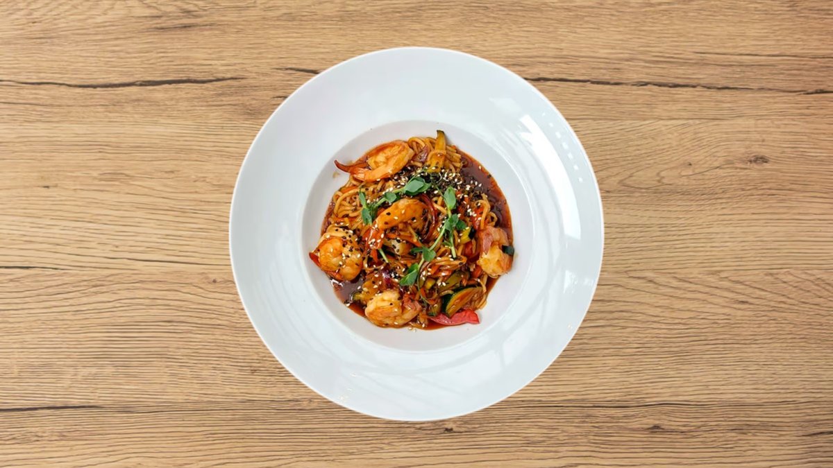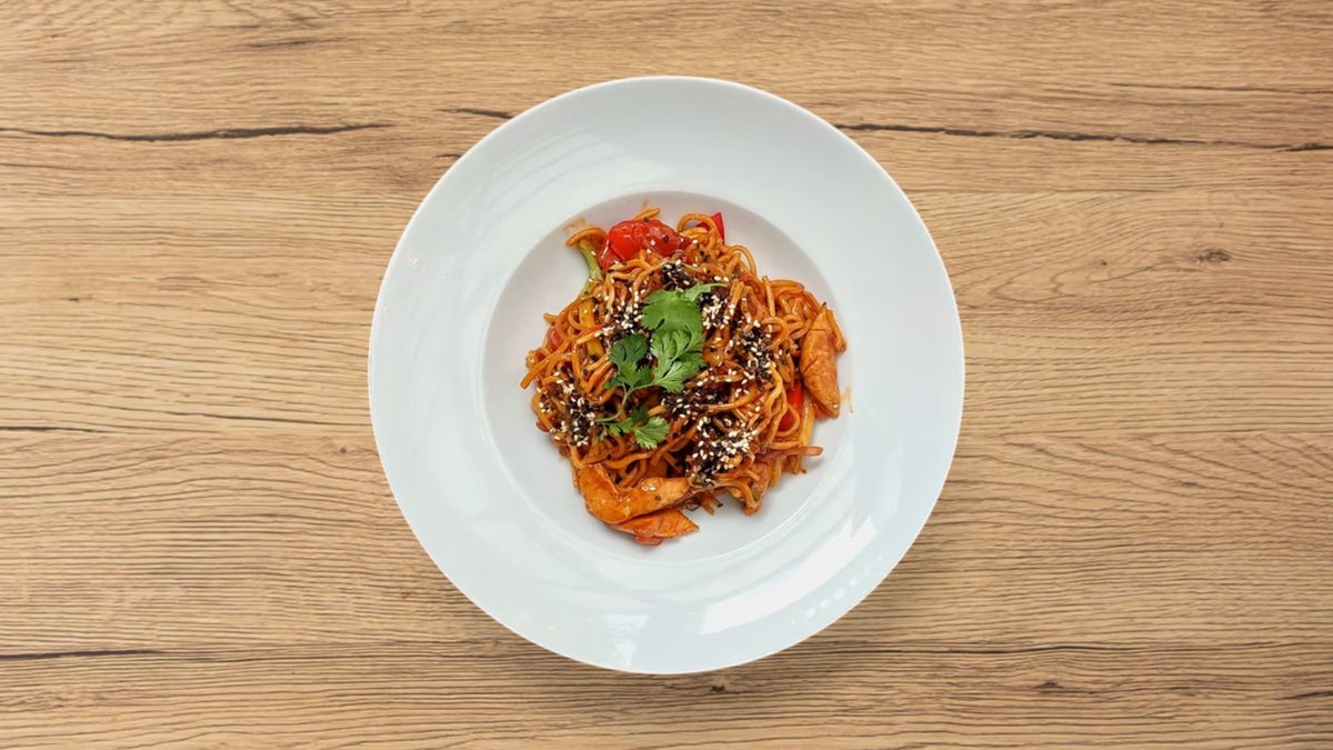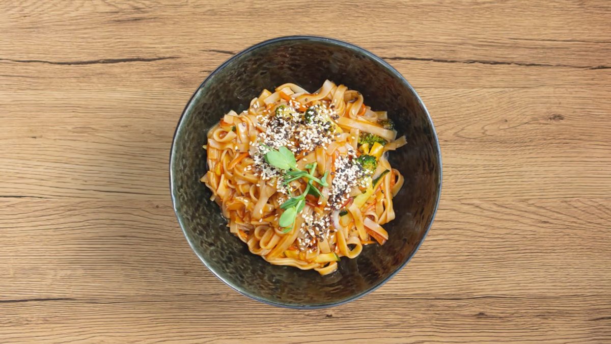 Burkāni, paprika, brokoļi, cukiņi, sipoli, olu nūdeles, terijaki mērce, sezama sēklas. Attēli ir orientējoši un tikai ilustratīviem nolūkiem. Iepakojums ir iekļauts ēdiena cenā.