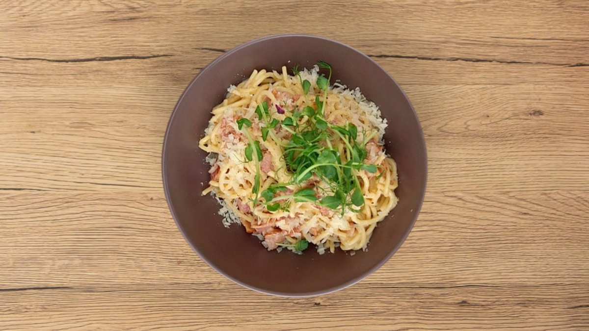 Bekons, saldais krējums, ola, cietais siers. Attēli ir orientējoši un tikai ilustratīviem nolūkiem. Iepakojums ir iekļauts ēdiena cenā.
