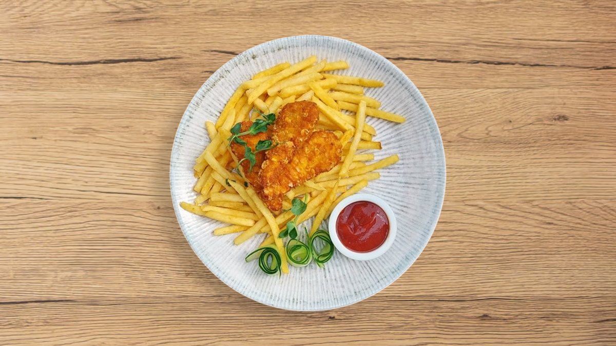 Cāļa filejas nageti ar frī kartupeļiem un gurķiem, tomātu mērci