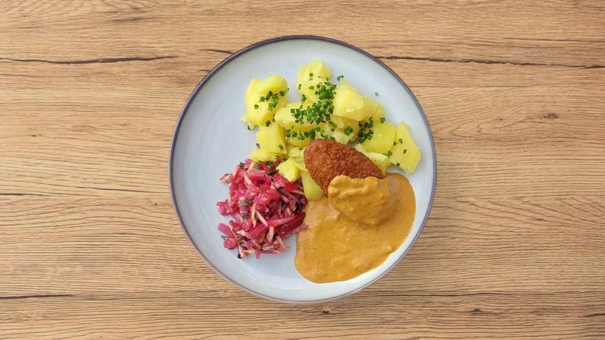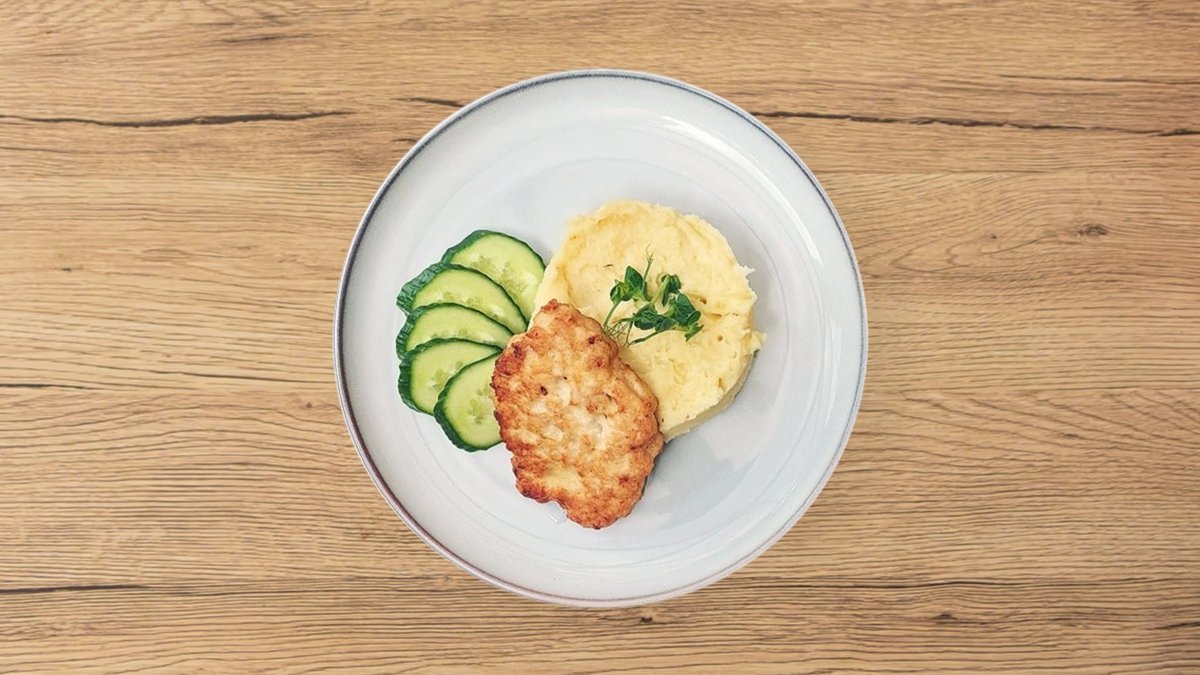 Smalki grieztas vistas filejas plācenīši. Ar kartupeļu biezeni un gurķiem. Attēli ir orientējoši un tikai ilustratīviem nolūkiem. Iepakojums ir iekļauts ēdiena cenā.