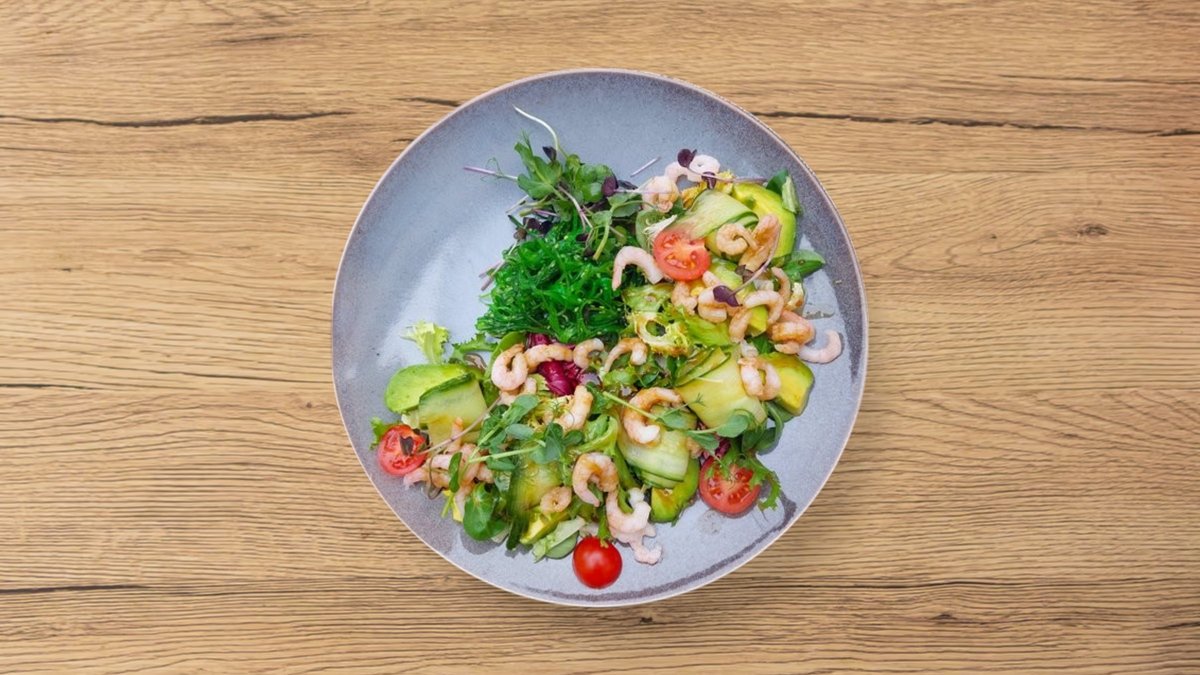 Salātlapas, tomāti, sv.gurķi, vakame, avokado, balzamico - medus mērce. Attēli ir orientējoši un tikai ilustratīviem nolūkiem. Iepakojums ir iekļauts ēdiena cenā.