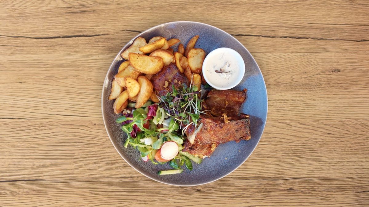 /kartupeļu biezenis, lapu salāti, ķiploku mērce/ Attēli ir orientējoši un tikai ilustratīviem nolūkiem. Iepakojums ir iekļauts ēdiena cenā.
