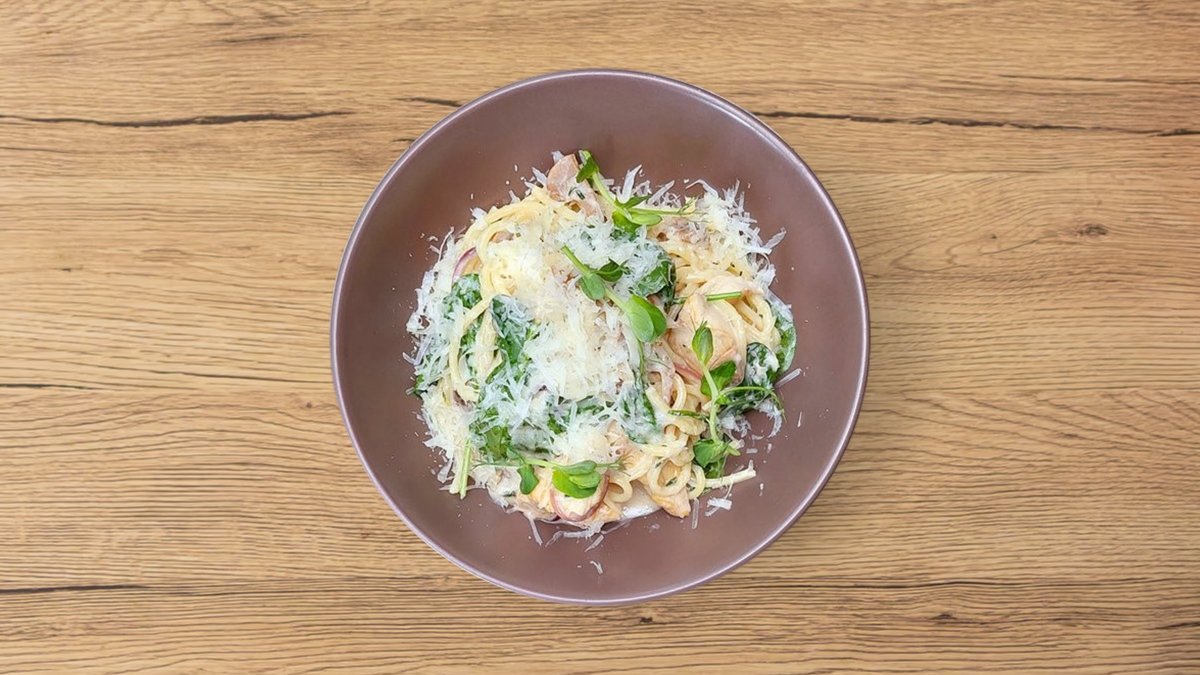 Sēnes, sipoli, timians, saldais krējums, siers, spināti. Attēli ir orientējoši un tikai ilustratīviem nolūkiem. Iepakojums ir iekļauts ēdiena cenā.