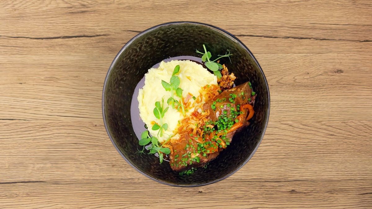 /kartupeļu biezenis, sīpolu čipsi, sarkanvīna-piparu mērce/ Attēli ir orientējoši un tikai ilustratīviem nolūkiem. Iepakojums ir iekļauts ēdiena cenā.