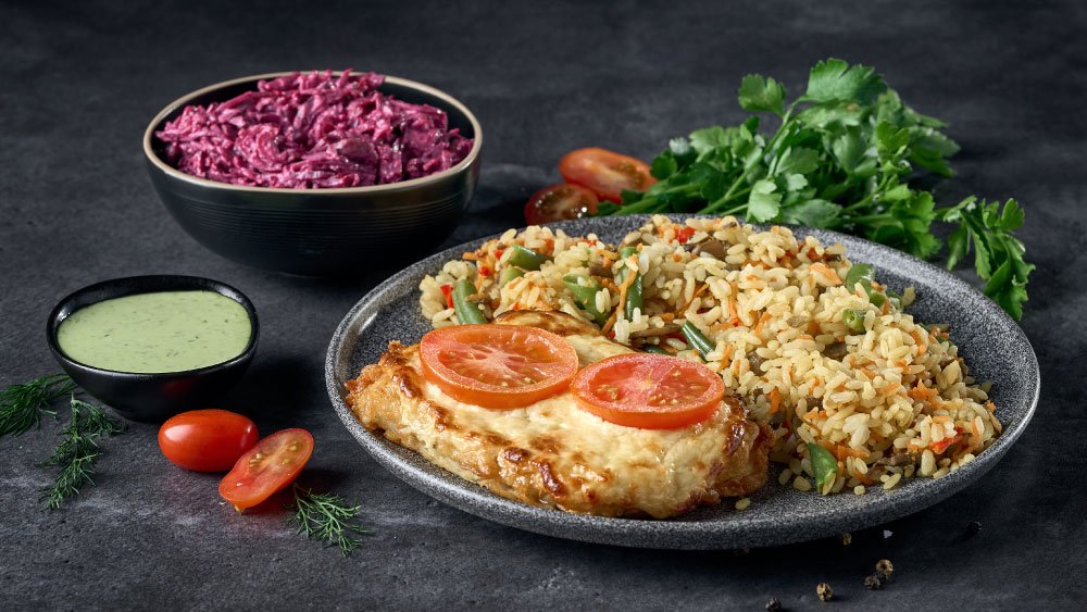 Biešu salāti ar marinētiem gurķiem Mintaja fileja ar tomātiem un sieru Rīsi ar dārzeņiem un sēnēm Diļļu mērce