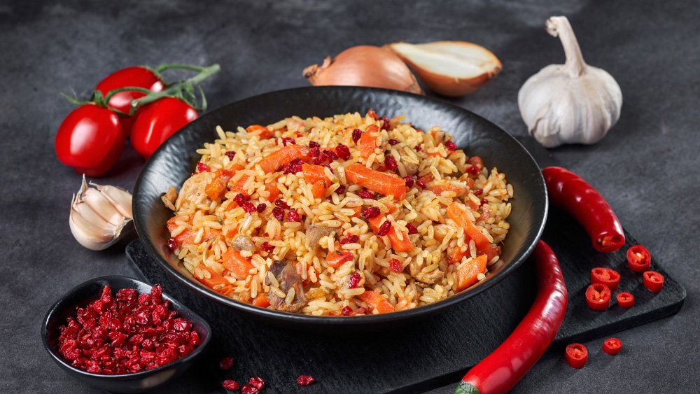 Rīsi basmati vārīti (ūdens, rīsi basmati, rapšu eļļa, sāls), cāļa giross (23.8%) (cāļa gaļa, ūdens, sīpoli, adžika mājas (ūdens, burkāni, tomāti, cukurs, tomātu pasta (tomātu koncentrāts, ūdens, sāls, rapšu eļļa)) , sāls, ķiploki, pipari čili, garšvielu maisījums (sāls, sausās paprikas pulveris, koriandrs malts, čilli malts, dilles, pētersīļi, etiķa esence, pipari asie čili malti, cukurs, adžika sausā (sāls, saldās paprikas pulveris, koriandrs, čilli, dilles, pētersīļi)), burkāni, sīpoli, burkāni, rapšu eļļa, garšvielas (zaļā paprika kaltēta, sarkanā paprika kaltēta, kumīna sēklas, bārbeļu ogas kaltētas, kurkuma malta), bārbeles ogas kaltētas, sāls, garšvielas (sāls, garšvielas, cukurs, citronu sulas pulveris, ciete, garšvielu ekstrakti, garšaugi, apelsīnu sulas pulveris, ābolu pulveris, papaijas ekstrakts), kurkuma malta