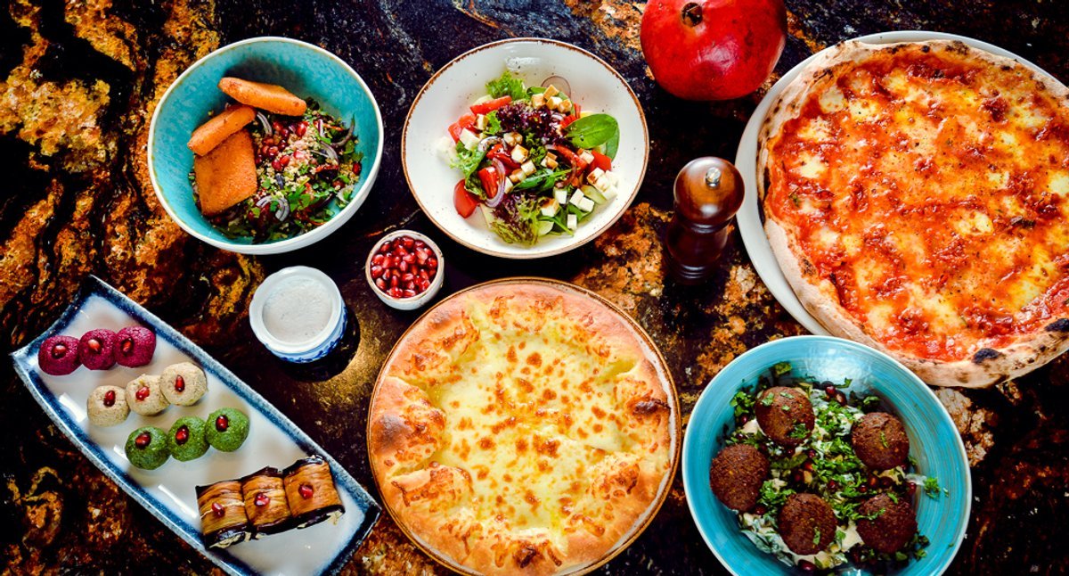 Humuss ar avokado mussu un Harisu. Baklažānu ikri "Chermoula". "Muhammara" (grillēta paprika ar valriekstiem un garšvielām). Olīvu un marinēto dārzeņu assorti. Tcatciki mērce ar pašmājas Brinzas sieru un Zataru. Pašmājas pita.