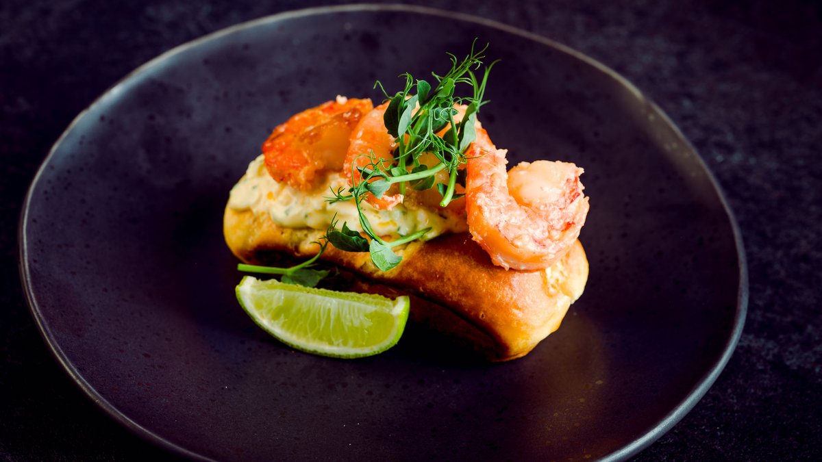 Brioche maizīte, olas, Black tiger garneles, gurķi, lociņi, majonēze, laims