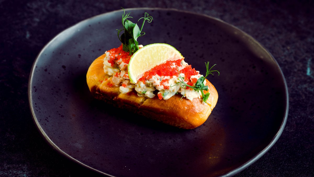 Brioche rolls ar tunča salātiem un lidojošās zivs ikriem