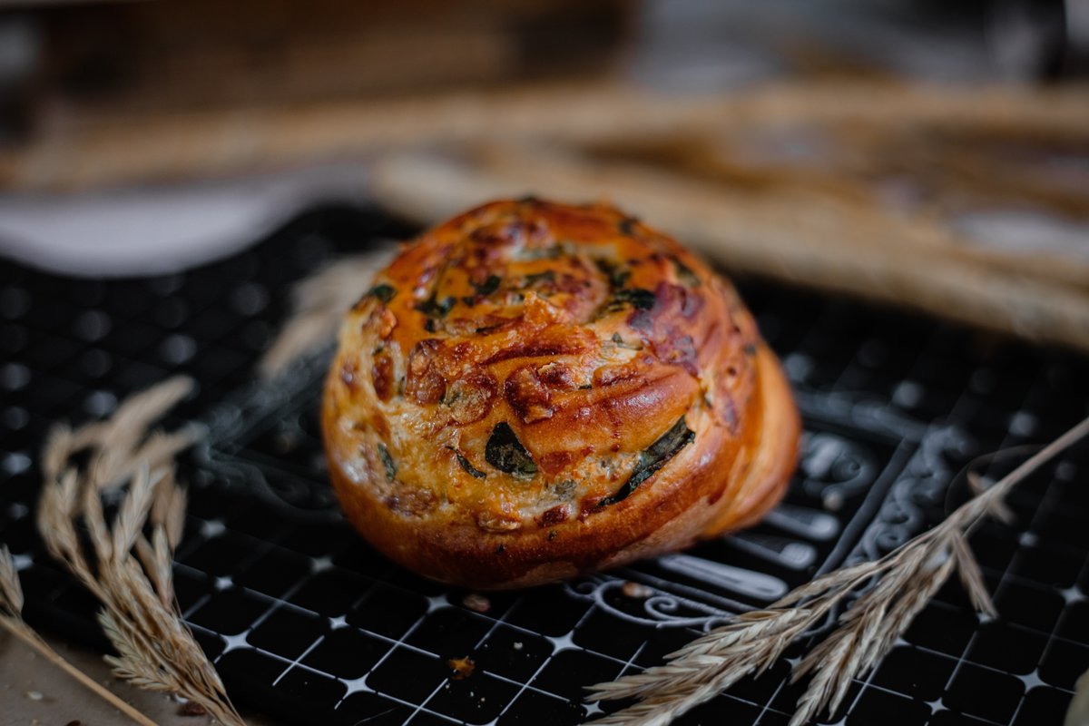 Svaigi cepta smalkmaizīte, kura gatavota no brioš mīklas, papildināta ar spinātiem un sieru