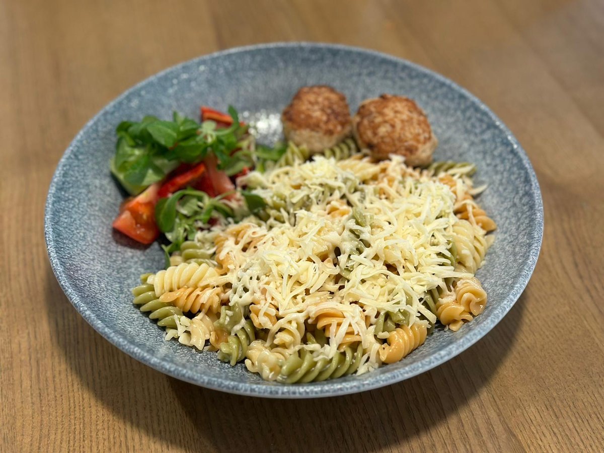 Vistas gaļas kotletītes ar makaroniem un sieru