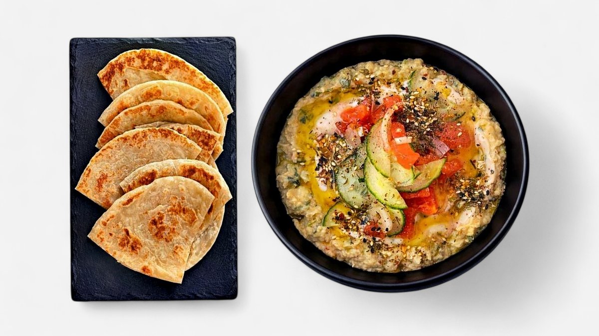 Dip mērce no cepta baklažāna, sezāma pastas, citronu sulas un olīveļļas