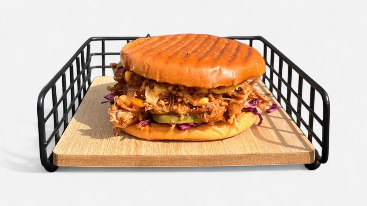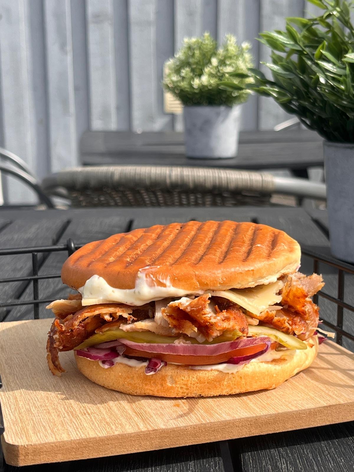 Vistas kebaba gaļa, salātlapas, marinēti gurķi, tomāti, kausēts Čedaras siers, sīpoli, gurķu mērce, burgeru maize.