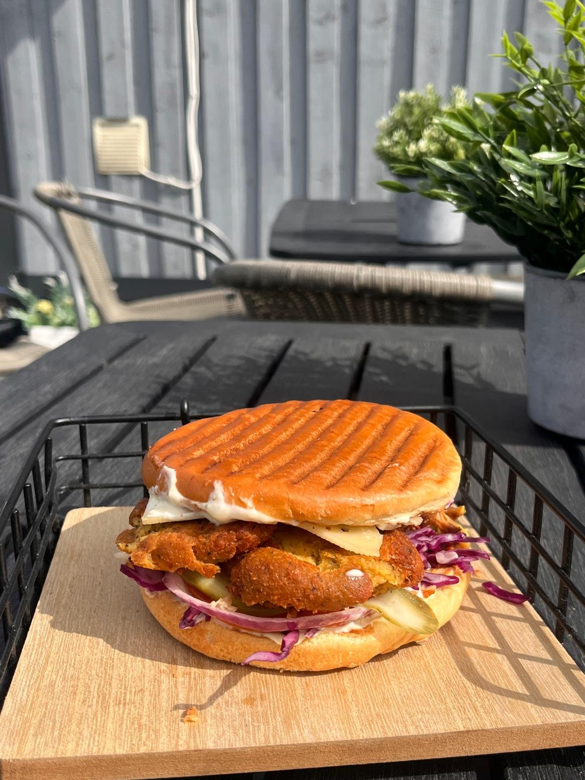 Falafel, salātlapas, marinēti gurķi, tomāti, kausēts Čedaras siers, sīpoli, gurķu mērce, burgeru maize.