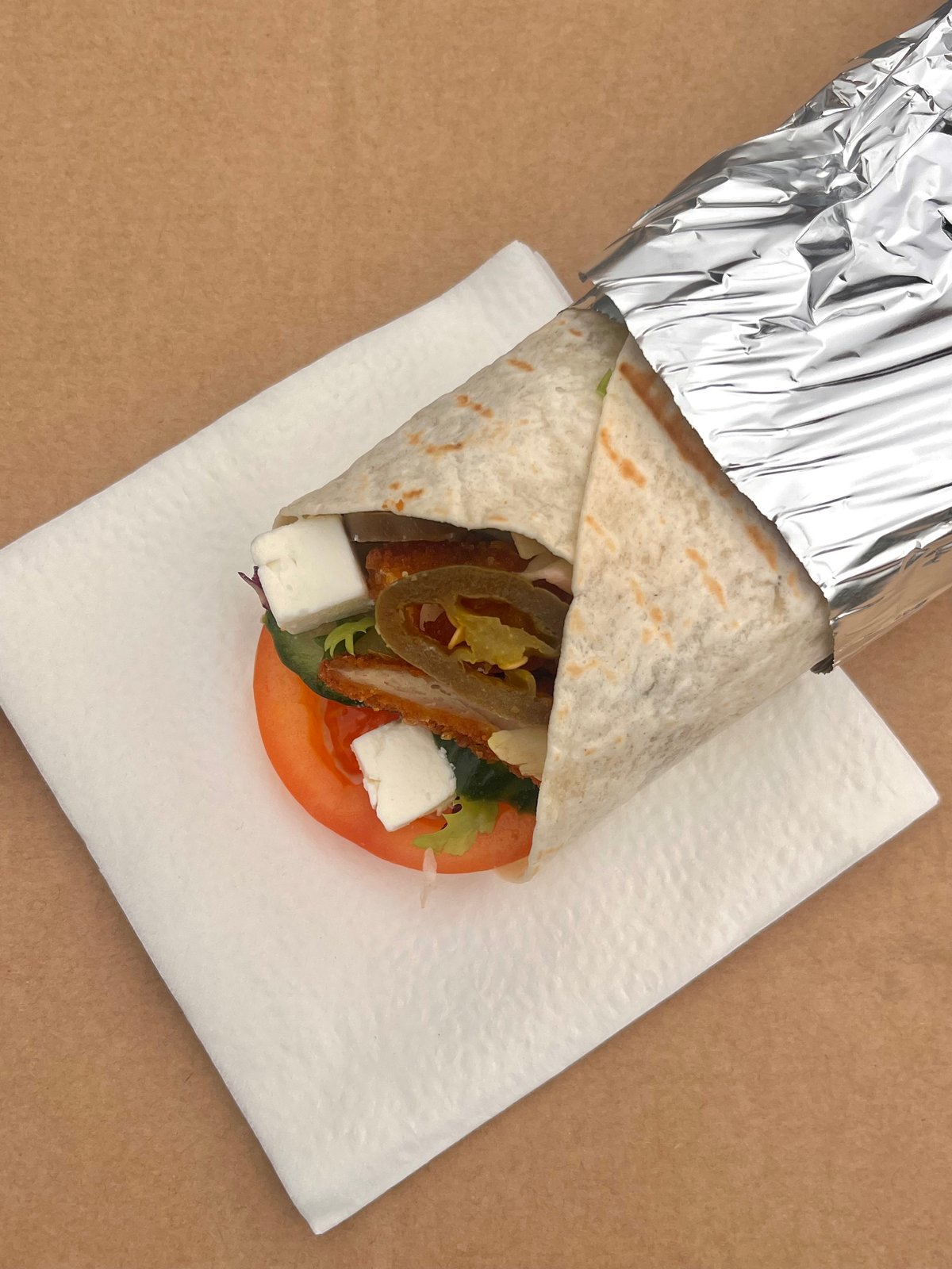 Vistas fileja panējumā, grieķu siers gabaliņos, tomāti, ledus salāti, paprikas mērce