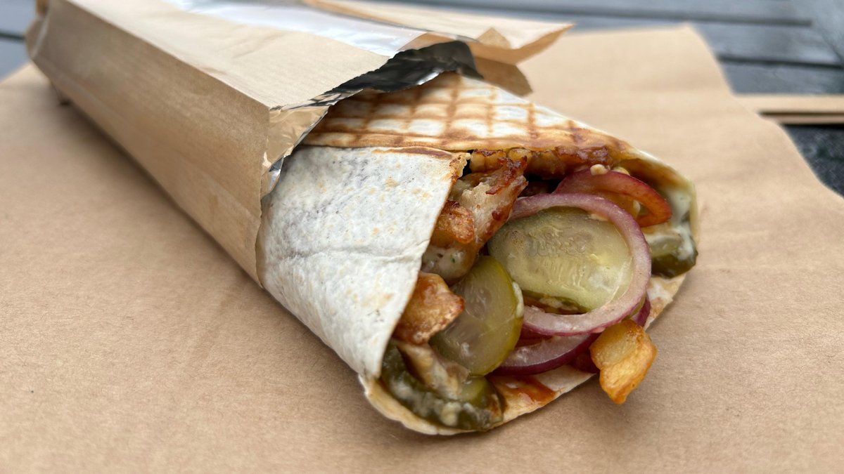 Vistas kebaba gaļa, marinēti gurķi, frī kartupeļi, granātabolu glazūru mērce ietīti lavašā.