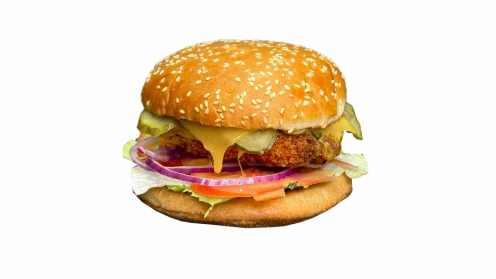 Pašgatavota vistas fileja cepta tempurā, čedaras siers, ledus salāti, tomāti, marinēti gurķi, sīpoli, gurķu mērce
