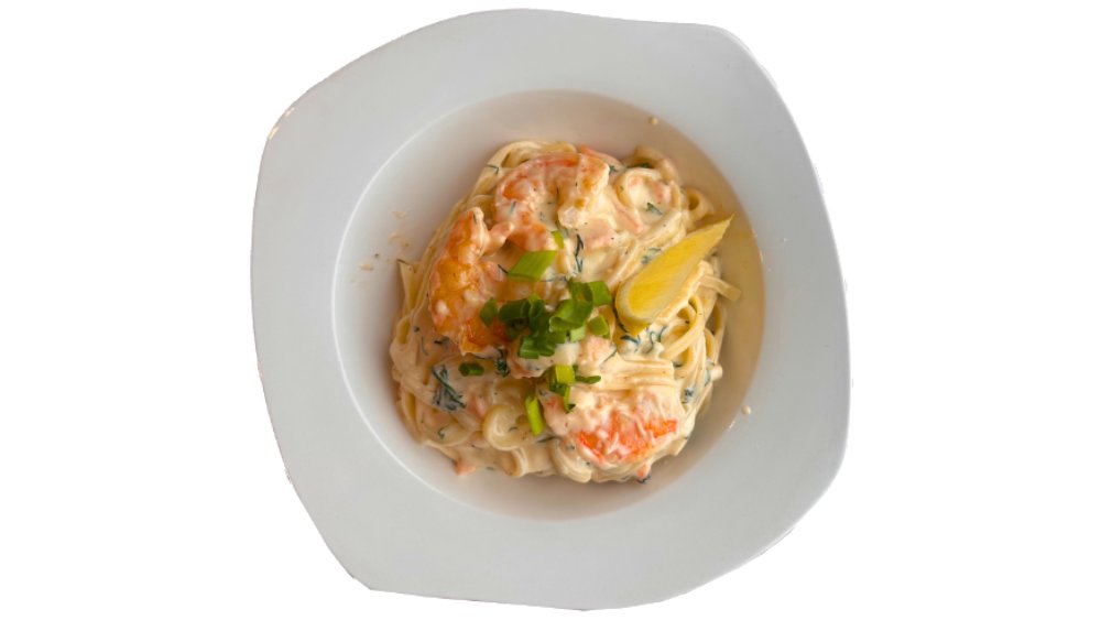 Lasis, tīģergarneles, pasta, saldais krējums, parmezāns, zaļumi