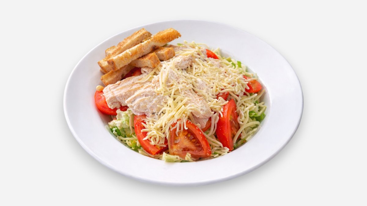 romiešu sal., cherry tomātiņi, grilēta vistas fileja, cietais siers, grauzdiņi, cēzara mērce
