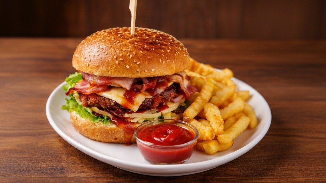 Liellopa gaļas kotlete ar sieru un bekonu. Cepta maizīte, salātlapa, tomāts, marinēti sīpoli, marinēts gurķis un BBQ mērcīte, frī kartupeļi