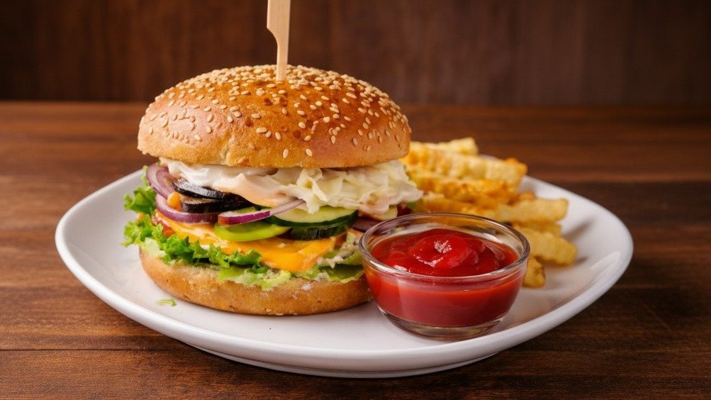 Vistas fileja ar sieru. Cepta maizīte, salātlapa, tomāts, marinēts gurķis un mērcīte, frī kartupeļi