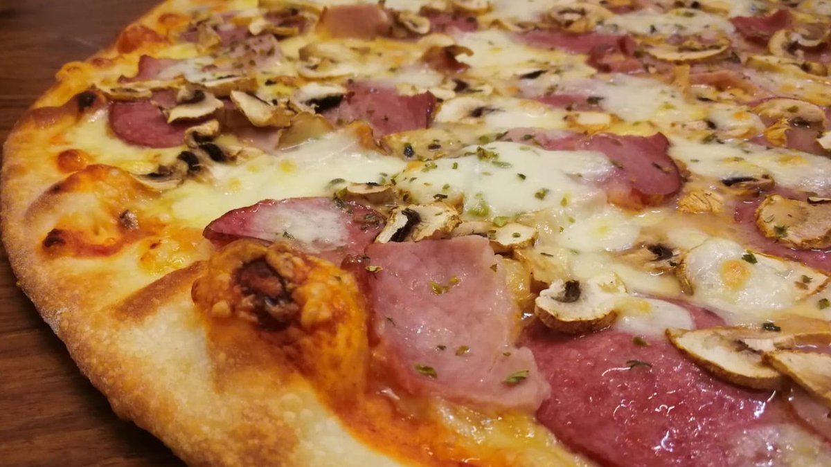 Picas mērce, siers, salami desa, bekons, sīpoli, šampinjoni, malti melnie pipari, mocarella siers