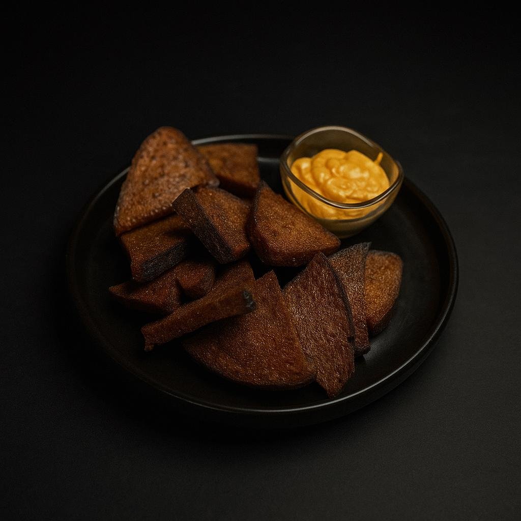 Ķiploku mērce, siers, bekons, grauzdēti sīpoli, ķiploks (laba uzkoda pie aliņa) :)