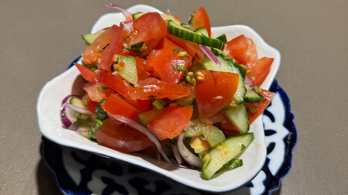 Tradicionālie uzbeku salāti, kas pagatavoti no tomātiem, gurķiem un sīpoliem ar nedaudz bazilika.