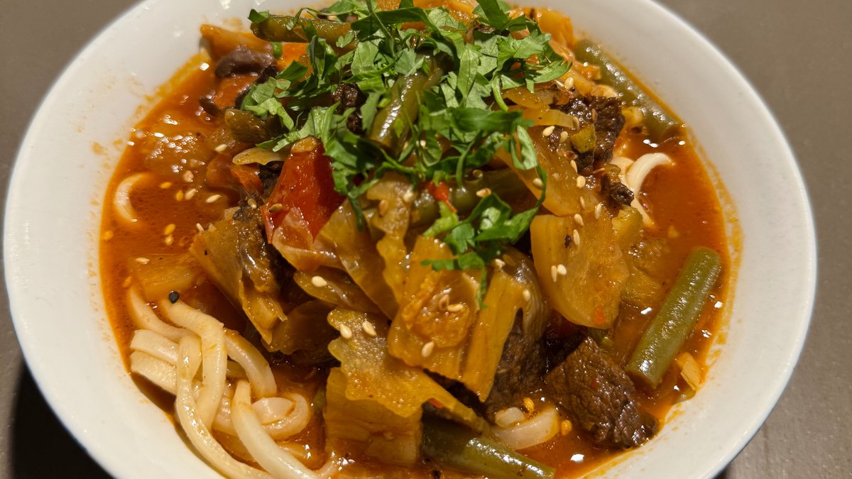 Aromātisks liellopa gaļas buljons ar lielos gabalos sagrieztiem dārzeņiem un austrumu garšvielām.