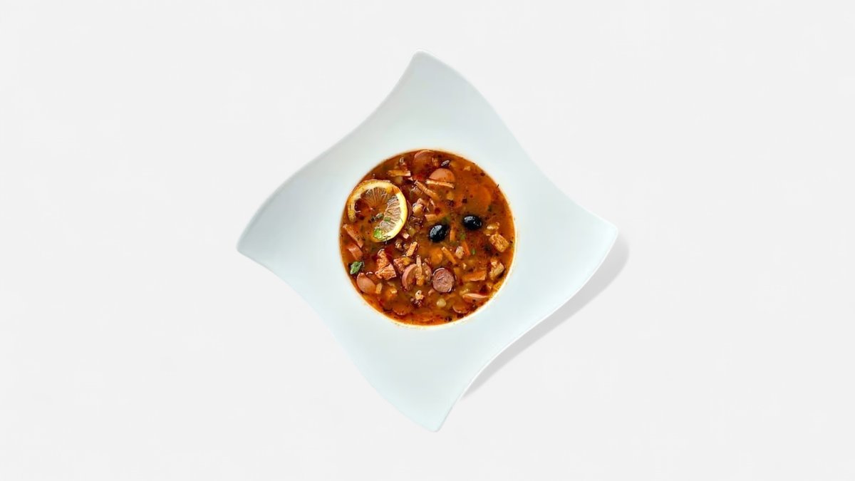 Sastāvdaļas: Sīpoli, cūkgaļa, burkāni, kartupeļi, marinēti gurķi, cukurs, sāls, mednieku desiņas, kūpināta karbonāde, tomātu pasta, melnās olīvas, citrons, pētersīļi