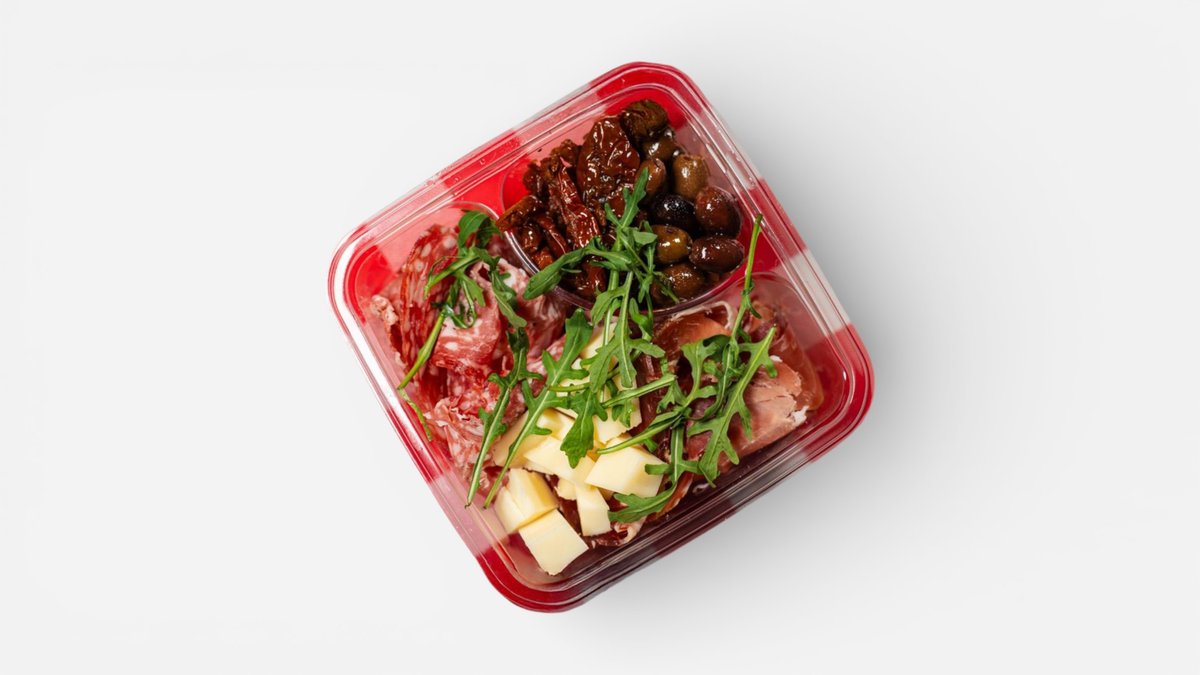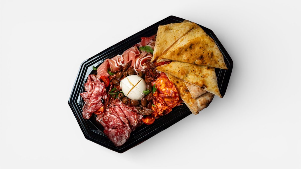 Vītināts prošuto Crudo, salami Napoli, pikantā salami Ventricina, auksti kūpinata vītināta cūkgaļa Speck, siers Burrata ar trifeļiem, melnās olīvas, saulē kaltēti tomāti, Schiacciata (itāļu kraukšķīga maize)