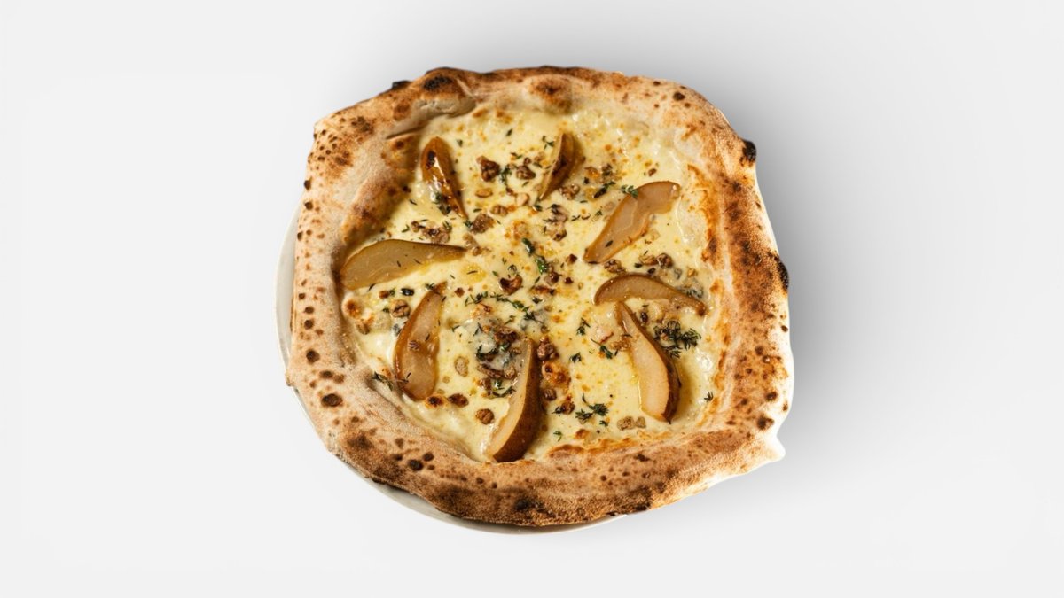 Ķirbju mērce, Mozzarella siers, Pancetta bekons, Gorgonzola piccante, Grana Padano DOP.