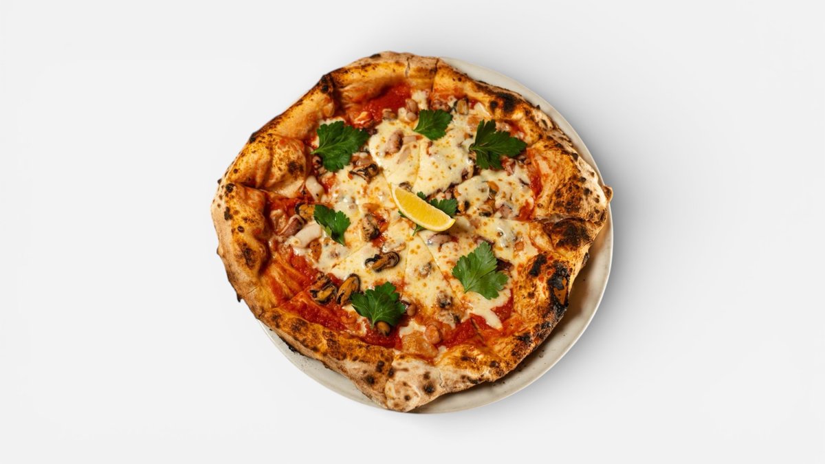 Tomatu mērce, Mocarella, kalmāri, mīdijas, gliemenes, garneles, astoņkāji, svaigas pētersīļu lapas, olīveļļa Extra Virgin
