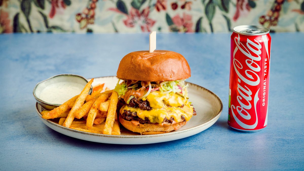 Latvijas liellopa gaļa / čedara siers / marinēti gurķi / marinētie sīpoli / brioš maizīte / rukola / trifeļu mērce + frī kartupeļi + mary mērce + dzēriens