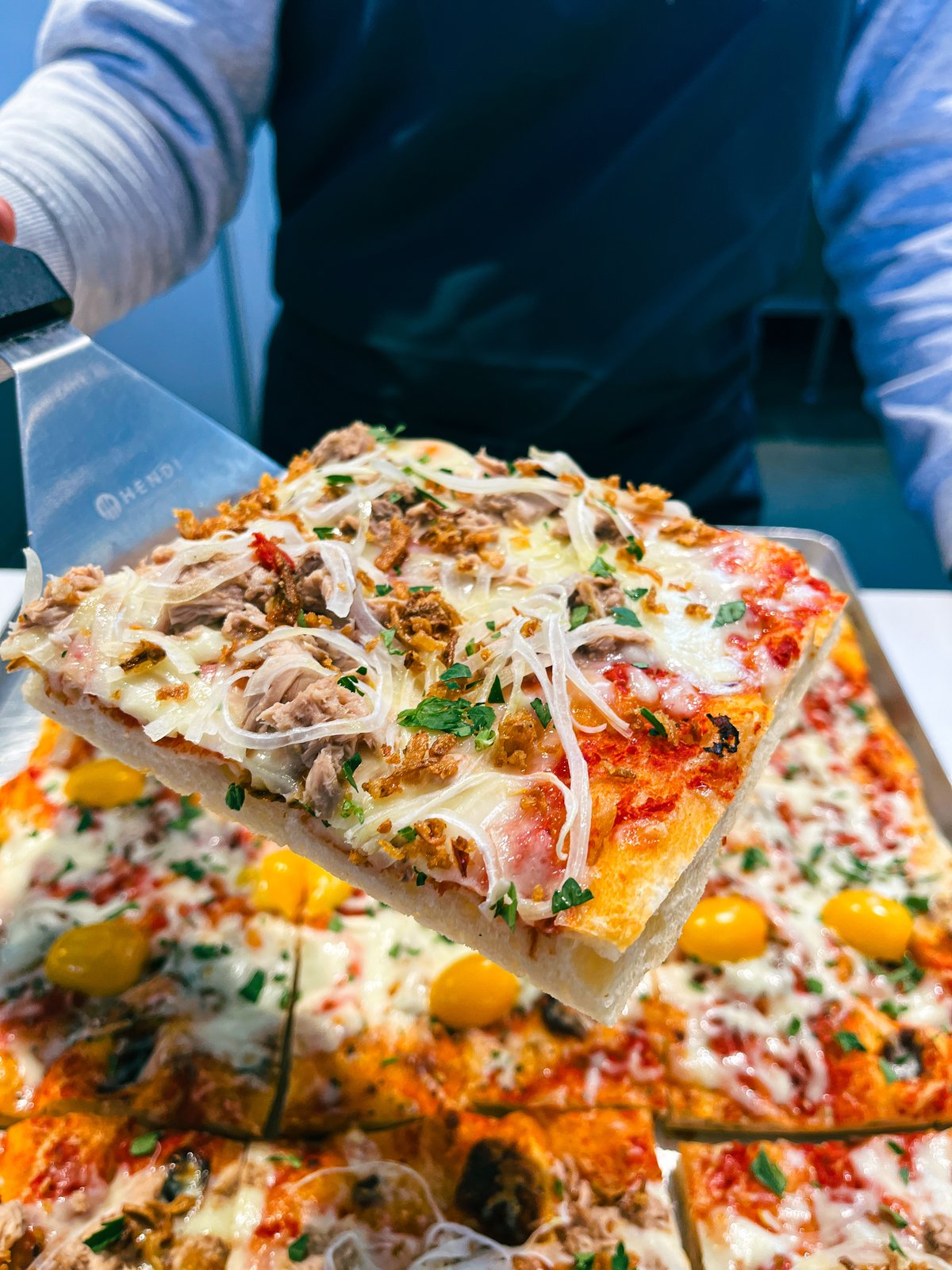 “Pizza al taglio” ir viens no populārākajiem ielu ēdieniem visā Itālijā🇮🇹 Paši itāļi to sauc par veselīgu “street food.” Mīkla ir īpaši gaisīga un tās pamatne - kraukšķīga. Visbiežāk picas tiek ceptas taisnstūra paplātēs ar dažnedažādām sastāvdaļām - paredzēta griešanai ar šķērēm un pārdošanai šķēlēs. Mūsu sortimentā ir vairāk par 20 dažādiem picu veidiem. Dienas ēdienkarte ir mainīga un atkarīga no cepēja garastāvokļa 😇 Lai labi garšo! 🍕