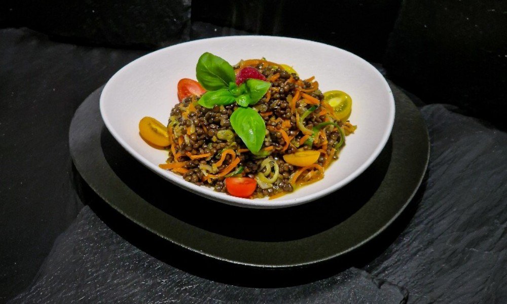 Melnās lēcas (Beluga) ar dārzeņiem un trifeļu eļļu