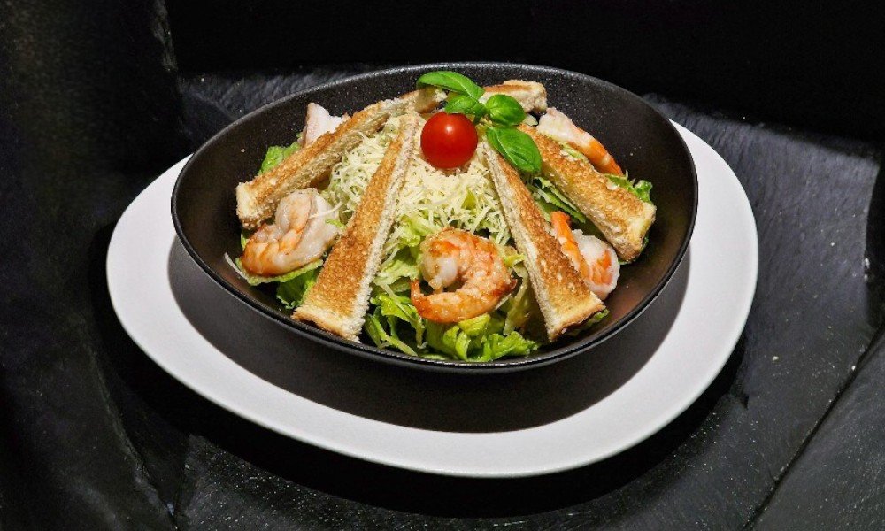 Cēzara salāti ar pašmāju pesto un tīģergarnelēm