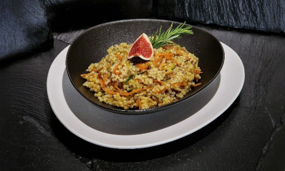 Pērļu grūbu gruboto ar baravikām, dārzeņiem un trifeļu eļļu