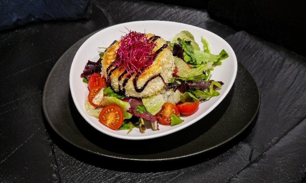 Svaigi panēts, cepts kamambēra siers ar jauktajiem lapu salātiem, cherry tomātiem, olīveļļu, balzamiko