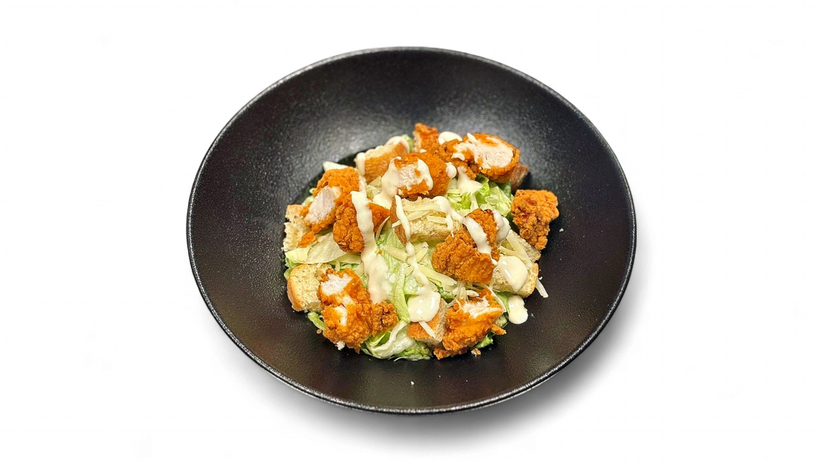 zaļie lapu salāti, cēzara mērce, parmezāns, grauzdēta maize, fritētas vistas strēmelītes