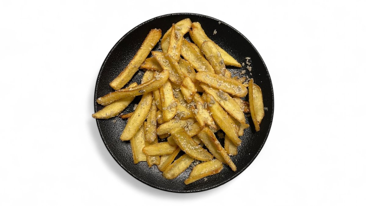 Fritētas kartupeļu šķēlītes ar pekorino sieru un melnajiem pipariem.