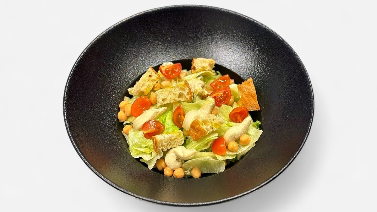 zaļie lapu salāti, ķirštomāti, hummus, turku zirņi, grauzdēta maize