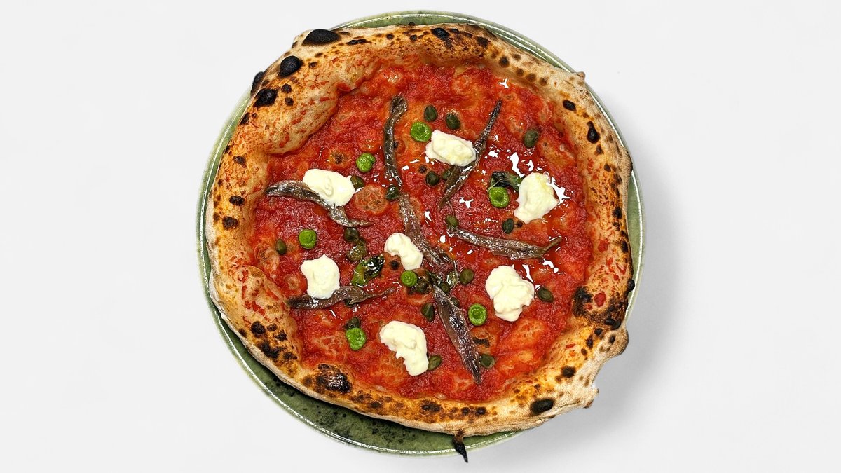 Porchetta, ricotta, pecorino, tomāti, baziliks, sīpoli, extra virgin olīveļļa, sāls