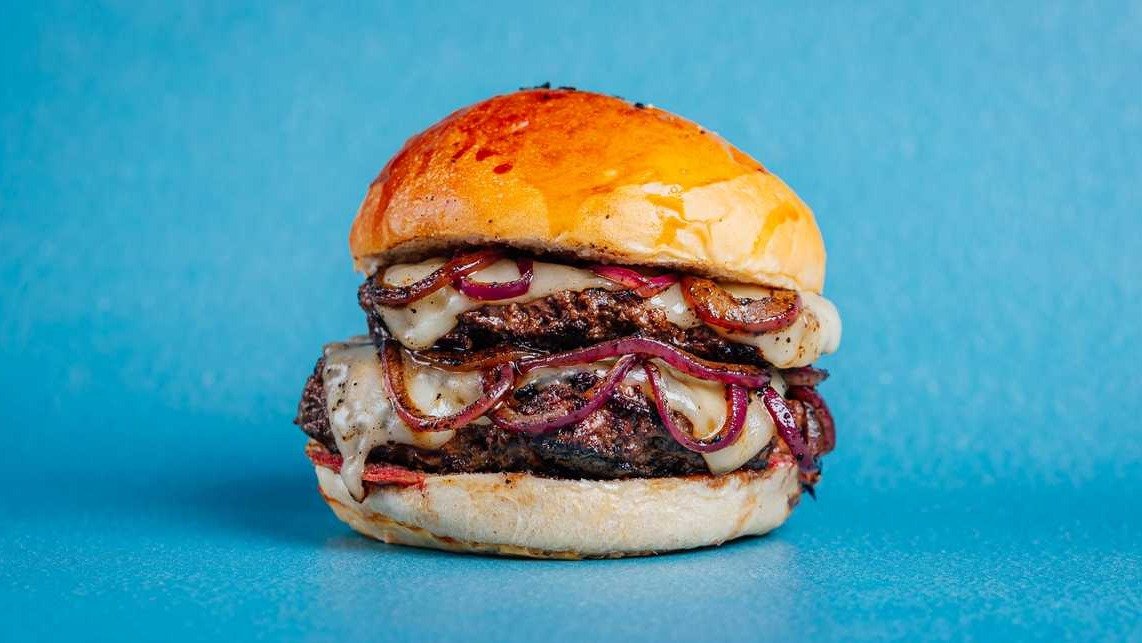 Mājas burgeru maizīte, 2 liellopa gaļas pīrādziņi ar karamelizētiem sīpoliem, amerikāņu siers, Texas BBQ un oriģinālās BBQ mērces