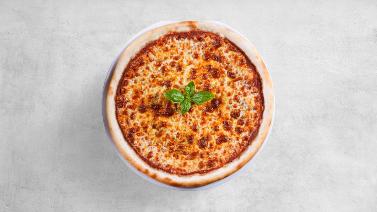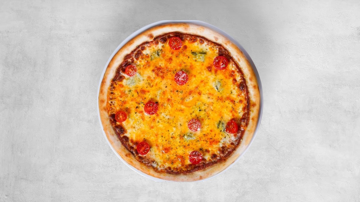 Tomātu mērce, mocarella siers, čederas siers, parmezāna siers, Rokforas siers, cherry tomāti, oregano.