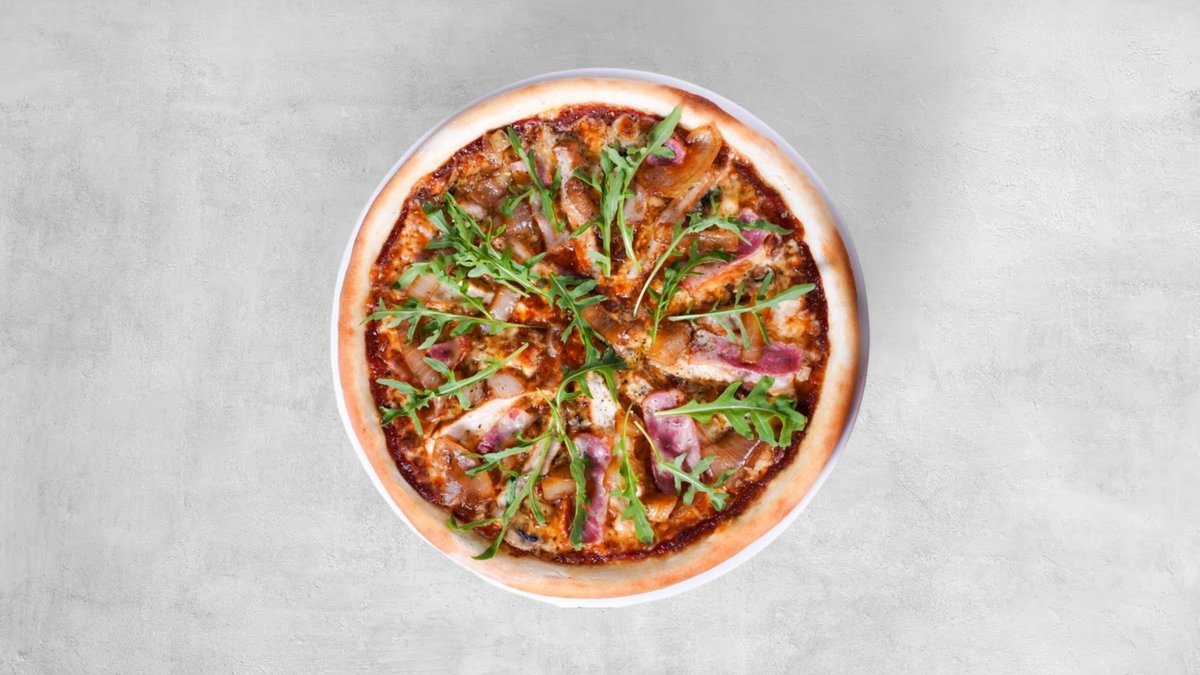 Tomātu mērce, bbq mērce, mocarella siers, bbq vista, bbq cukgaļa, bekons, sēnes, karamelizēti sīpoli, rukola.