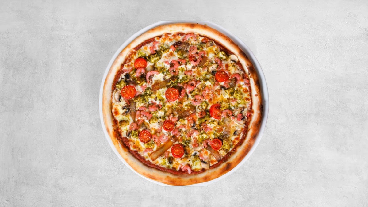 Tomātu mērce, mocarella siers, pikantās garneles, vista pesto mercē, sēnes, karamelizēti sīpoli, cherry tomāti.