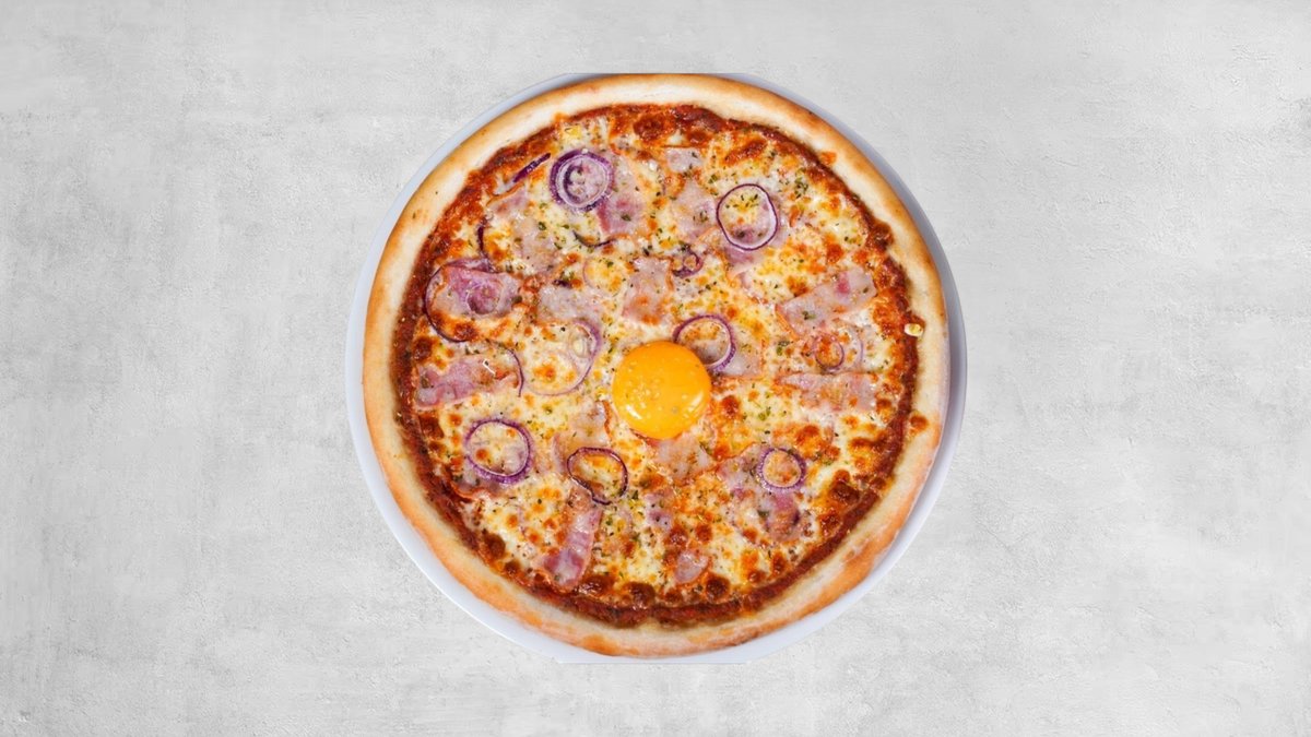 Tomātu mērce, mocarella siers, parmezāna siers, bekons, sarkanie sīpoli, olas dzeltenums.
